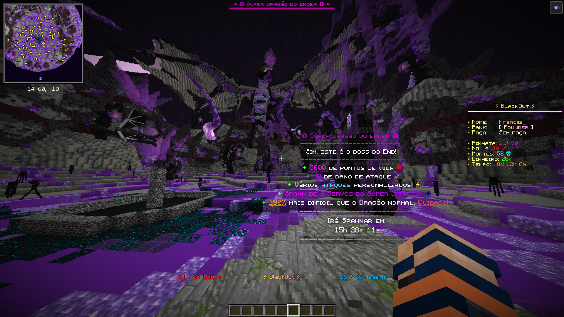<figure><img src="https://2464883995-files.gitbook.io/~/files/v0/b/gitbook-x-prod.appspot.com/o/spaces%2FX4ttJC6Pgz9brIH1HW65%2Fuploads%2FnNPLxH3qDgYZg9Dsq1tH%2Fimage.png?alt=media&#x26;token=f3bc19dc-2883-4fe7-8125-ecdbf003b512" alt="" width="375"><figcaption><p>Apenas o primeiro spawn do END!</p></figcaption></figure>