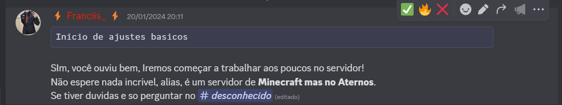 <p align="center">O Eduardo e o Will, amigos meus antigos, antigamente, estamos a falar de 2023-2024<br>criaram 3 servidores, um deles, o <a data-footnote-ref href="#user-content-fn-22"><mark style="color:$danger;">DarkCraft</mark></a> que realmente foi onde eu começei a minha carreira de DEV e de admin, o <a data-footnote-ref href="#user-content-fn-23"><mark style="color:$success;">ALOHACRAFT</mark></a><a data-footnote-ref href="#user-content-fn-24"> </a>fez me realmente, gostar de ser DEV e desenvolver as minhas capacidades!</p>