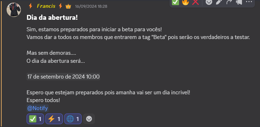 <figure><img src="https://2464883995-files.gitbook.io/~/files/v0/b/gitbook-x-prod.appspot.com/o/spaces%2FX4ttJC6Pgz9brIH1HW65%2Fuploads%2FIDtrsYZZFOcA2EfEbYc5%2Fimage%20(27).png?alt=media&#x26;token=cbd9de07-ad14-4ae7-8ec2-3c8937b3145c" alt="" width="375"><figcaption><p>Começo da Beta 16/09/2024<br>Aternos</p></figcaption></figure>