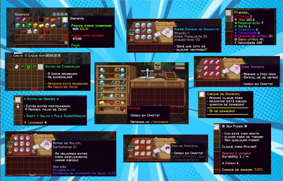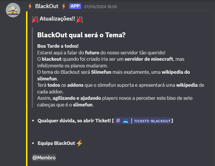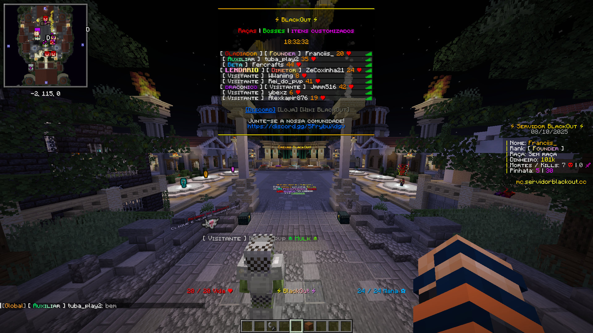 <img src="https://cdn.discordapp.com/emojis/1244981926625021954.webp?size=56" alt=":4366minecraftaccept:" data-size="line"> Adicionado **NPC´s** para facilitar a utilização dos **sistemas do servidor.**\ <img src="https://cdn.discordapp.com/emojis/1244981926625021954.webp?size=56" alt=":4366minecraftaccept:" data-size="line"> [**Trocador** agora tem uma nova **localidade** que irá ser mais apelativa para mais NPC´s! Faça **/trocador** para ir nele!](#user-content-fn-11)[^11]\ <img src="https://cdn.discordapp.com/emojis/1244981926625021954.webp?size=56" alt=":4366minecraftaccept:" data-size="line"> Ajustado o Lag do servidor, agora menos lag **mais diversão!**\ <img src="https://cdn.discordapp.com/emojis/1244981926625021954.webp?size=56" alt=":4366minecraftaccept:" data-size="line"> Adicionado [**Reinícios automáticos**](#user-content-fn-12)[^12] em cada 4 horas, para melhor desempenho do servidor!<img src="https://cdn.discordapp.com/emojis/1244981926625021954.webp?size=56" alt=":4366minecraftaccept:" data-size="line"> Adicionado novas receitas para fazer itens! Faça **/recipes** para tal!\ <img src="https://cdn.discordapp.com/emojis/1244981926625021954.webp?size=56" alt=":4366minecraftaccept:" data-size="line"> Adicionado o **/playtime claim** que é o plugin que o seu **tempo** seja valorizado no BlackOut! Tem a explicação no **/ajuda**\ <img src="https://cdn.discordapp.com/emojis/1244981926625021954.webp?size=56" alt=":4366minecraftaccept:" data-size="line"> Adicionado novos itens às Caixas: [**Poção venenosa, armadura de cavalo, armadura suprema de cachorro, Capacete de construtor, Livros encantados, Lucky Blocks**](#user-content-fn-13)[^13] entre muitos outros! \ <img src="https://cdn.discordapp.com/emojis/1244981926625021954.webp?size=56" alt=":4366minecraftaccept:" data-size="line"> Adicionado **TOAST´s** que são **conquistas automaticas** que aparecem na sua tela! Apenas **Java** conseguem ver isso, **Infelizmente Bedrock e Mobile não conseguem!**<img src="https://cdn.discordapp.com/emojis/1244981926625021954.webp?size=56" alt=":4366minecraftaccept:" data-size="line"> Ajustado o **RTP** para melhor **performance!** \ <img src="https://cdn.discordapp.com/emojis/1244981926625021954.webp?size=56" alt=":4366minecraftaccept:" data-size="line"> Adicionado **ANTI-XRAY**, um plugin super forte para apanhar **cheaters!** Quero ver vocês a tentar fazer **xray** :D\ <img src="https://cdn.discordapp.com/emojis/1244981926625021954.webp?size=56" alt=":4366minecraftaccept:" data-size="line"> Adicionado **Itens customizados** que irão ser lançados com o tempo!\ <img src="https://cdn.discordapp.com/emojis/1244981926625021954.webp?size=56" alt=":4366minecraftaccept:" data-size="line"> Ajustado o **/kits** para melhor entendimento, e melhorar o **KIT BETA!**\