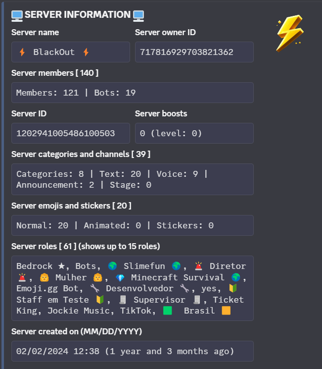 <figure><img src="https://2464883995-files.gitbook.io/~/files/v0/b/gitbook-x-prod.appspot.com/o/spaces%2FX4ttJC6Pgz9brIH1HW65%2Fuploads%2FNzQS1YZUf8AxhhLNbBhd%2F2023-09-12_16.37.25.png?alt=media&#x26;token=d5c9fb90-dd8f-4c0d-824b-8a3ff0513a37" alt="" width="375"><figcaption><p>Um servidor incrivel, que eu amei fazer!</p></figcaption></figure>