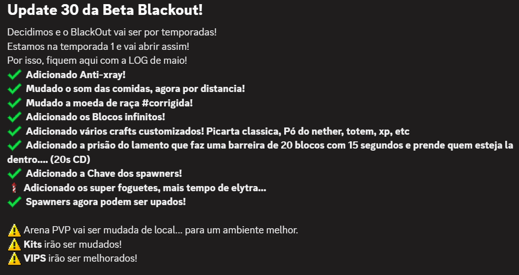 **Irei listar aqui algumas funções novas!**\ <img src="https://cdn.discordapp.com/emojis/1244981926625021954.webp?size=56" alt=":4366minecraftaccept:" data-size="line"> Nova Raça no BlackOut, a **SuperVaca!**\ <img src="https://cdn.discordapp.com/emojis/1244981926625021954.webp?size=56" alt=":4366minecraftaccept:" data-size="line"> Novos itens em todas as caixas!\ <img src="https://cdn.discordapp.com/emojis/1244981926625021954.webp?size=56" alt=":4366minecraftaccept:" data-size="line"> Novos GUI de comandos, **/raças, /warps /bosses!**\ <img src="https://cdn.discordapp.com/emojis/1244981926625021954.webp?size=56" alt=":4366minecraftaccept:" data-size="line"> Criado o novo boss **Mega Warden!**\ <img src="https://cdn.discordapp.com/emojis/1244981926625021954.webp?size=56" alt=":4366minecraftaccept:" data-size="line"> Atualizado o /spawn para funcionar agora!\ <img src="https://cdn.discordapp.com/emojis/1244981926625021954.webp?size=56" alt=":4366minecraftaccept:" data-size="line"> O que muitos estavam a espera! [**Quando deslogar do servidor, irá ficar na mesma posição quando voltar novamente ao servidor!!!**](#user-content-fn-4)[^4]\ <img src="https://cdn.discordapp.com/emojis/1244981926625021954.webp?size=56" alt=":4366minecraftaccept:" data-size="line"> AuthMe plugin instalado para mais segurança no servidor!\