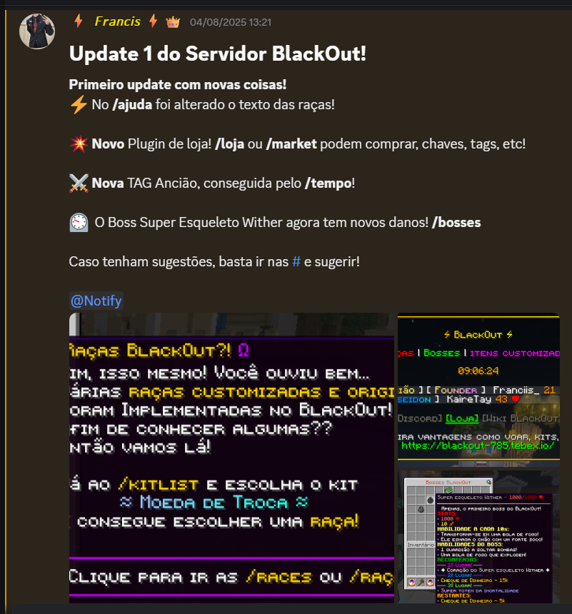 <img src="https://cdn.discordapp.com/emojis/1244981926625021954.webp?size=56" alt=":4366minecraftaccept:" data-size="line"> Adicionado 2 novos sites de voto! **/votar**\ <img src="https://cdn.discordapp.com/emojis/1244981926625021954.webp?size=56" alt=":4366minecraftaccept:" data-size="line"> Adicionado [novas Conquistas ao servidor!](#user-content-fn-8)[^8]\ <img src="https://cdn.discordapp.com/emojis/1244981926625021954.webp?size=56" alt=":4366minecraftaccept:" data-size="line"> Adicionado Local de **Pinhata!** **/Warp**\ <img src="https://cdn.discordapp.com/emojis/1244981926625021954.webp?size=56" alt=":4366minecraftaccept:" data-size="line"> [Adicionado recompensas de **tempo** no jogo! **/playtime claim**](#user-content-fn-9)[^9]\ <img src="https://cdn.discordapp.com/emojis/1244981926625021954.webp?size=56" alt=":4366minecraftaccept:" data-size="line"> Adicionado a nova raça **super anjo.**\ <img src="https://cdn.discordapp.com/emojis/1244981926625021954.webp?size=56" alt=":4366minecraftaccept:" data-size="line"> Adicionado um item de UNBAN do servidor à loja! [Aqui](https://blackout.minesite.org/) <mark style="color:$info;">Site antigo...</mark>\ <img src="https://cdn.discordapp.com/emojis/1244981926625021954.webp?size=56" alt=":4366minecraftaccept:" data-size="line"> **Diminuido o Lag** constante, agora **menos lag** e **mais diversão!** \ <img src="https://cdn.discordapp.com/emojis/1244981926625021954.webp?size=56" alt=":4366minecraftaccept:" data-size="line"> Adicionado o [**Anti-cheat BlackOut!**](#user-content-fn-10)[^10]